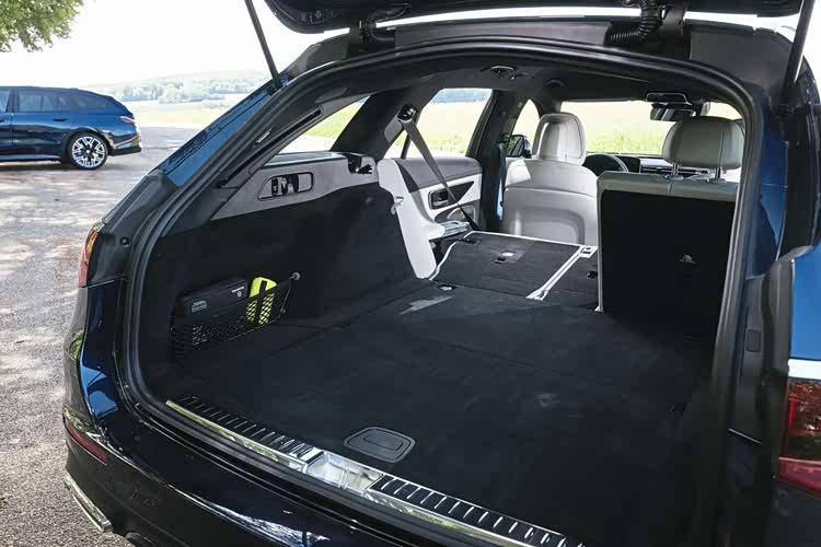 与奔驰旅行车的车尾一样,这里(BMW 5系旅行车车尾)也只需无损地越过那涂了漆且较低的装载门槛就行。两款车的后排座椅靠背都可以通过遥控分三段放倒,但宝马旅行车的座椅靠背放倒后并不完全平整,而是会微微上翘。宝马旅行车行李厢最大容积为1700升,与奔驰E级旅行车615~1830升的容积相比,其行李厢空间就显得更容易看清全貌了。宝马车在空间上的劣势还源于它那更平坦的底部储物空间。在这个空间里,宝马车虽然放不下购物箱,但是可以收纳行李遮物帘。使用时遮物帘能顺滑地进入导轨,而不像奔驰车那样无依托地卷起来。