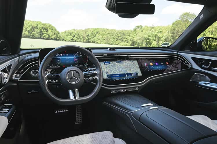 当然,对熟悉奔驰E级车的老用户来说,它的操作便利性也没好到哪儿去,尤其是还得在双辐式方向盘的辐条周围进行触摸操作。不过,你可以静下心来好好打量一下这个包覆着绒面皮革的豪华驾乘空间!那富有雕塑感的仪表板巧妙地集成了三块显示屏,而且车内各处都布置了彩色的装饰元素。可进行多种配置的显示内容会以3D动画的形式跃入眼帘,而前挡风玻璃上的平视显示系统能虚拟呈现出整个行车道的情况,副驾驶的乘客在车辆行驶时还能观看YouTube视频呢。