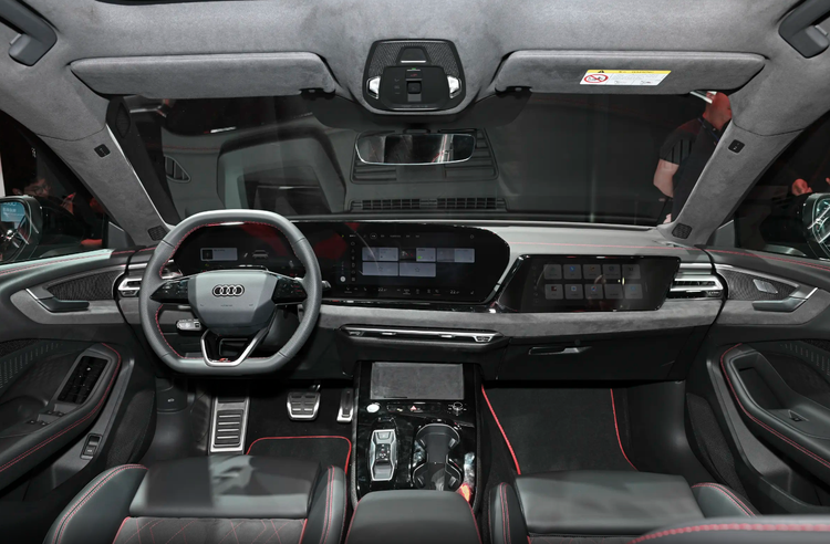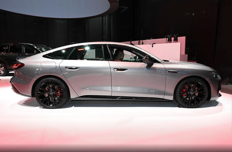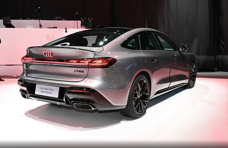 关键是车身侧面有半隐藏的把手,黑武士风格轮毂搭配运动刹车卡钳,而且有一个大差别就是上汽奥迪提供了更炫酷的无框玻璃车门,而且车顶的后半段确实采用了掀背大溜背的效果,尾部除了有带熏黑质感的贯穿尾灯,后尾箱的收尾部分还延伸出了比较立体的小尾翼装饰。总体来看是有点西装暴徒的意思了。