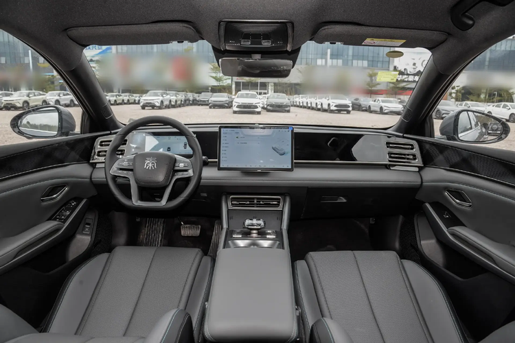 秦L DM-i采用了环绕式中控台布局,三辐式平底方向盘前端布局有8.8英寸数字仪表盘,中控位置则为可旋转的12.8英寸悬浮触控屏,而中控台上则采用了贯穿式烤漆饰板,并通过细长条金属进行边缘包围。中控下层与门板处都带有缝线软包,并同样形成了环绕式装饰。此外,车辆的电子换挡挡把采用了切割设计,而座椅则采用了三段式设计,并带有宽大侧翼包围与独立可调头枕。
