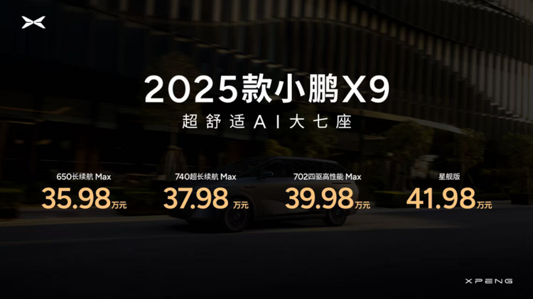 发布会上,全球旗舰、超舒适AI大七座2025款小鹏X9正式上市,新车共发布四个版本,包括650长续航Max、740超长续航Max、702四驱高性能Max以及星舰版,官方指导售价分别为35.98万元、37.98万元、39.98万元以及41.98万元。至2025年6月30日(含)前支付5000元定金的用户,可享购车好礼、置换复购礼、交付礼、无忧用车礼等多重上市订购权益。小鹏汽车还贴心回馈老款小鹏X9车主,通过硬件OTA的形式免费升级百万级的静谧性OTA套装、限时付费升级过道版零重力太空座椅套装、限时众筹升级流媒体内后视镜OTA套装以及智能电动遮阳帘OTA套装,诚意满满。