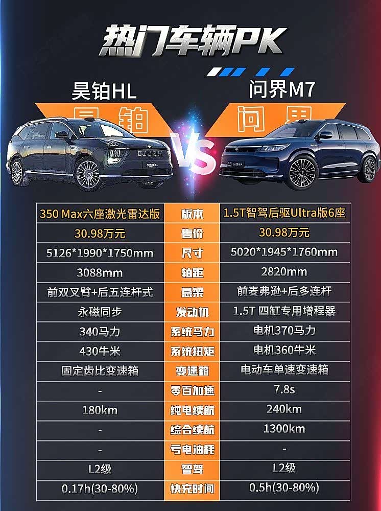 昊铂HL 2025款350 Max六座激光雷达版售价为29.98万元,问界M7 2024款1.5T智驾后驱Ultra版6座售价为30.98万元,两款车均为6座中大型SUV,售价也比较接近,那么哪一款车更值得入手呢?