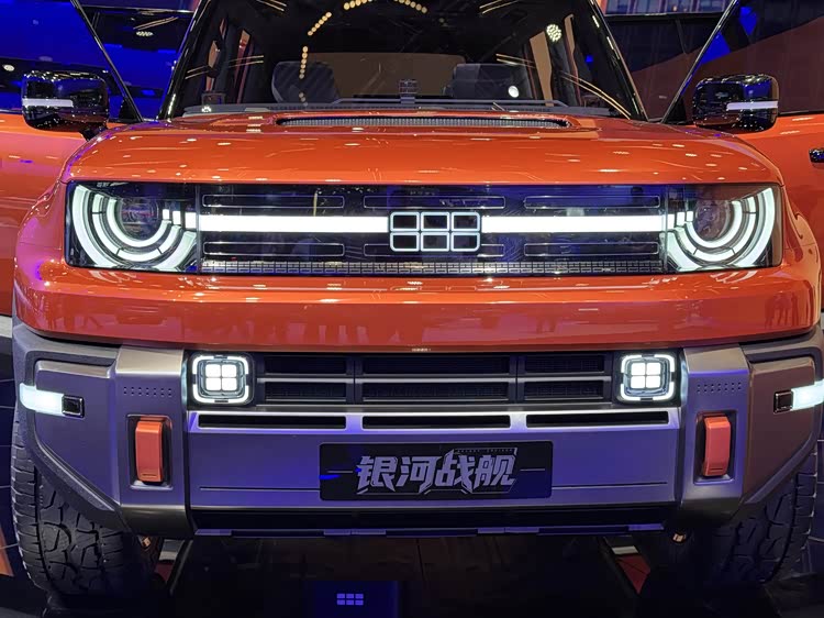 银河战舰的前方大灯犹如一双明亮的大眼睛,展现出了一个可爱的面容。这正是它与方程豹豹5这类车型在设计上的显著差异。
