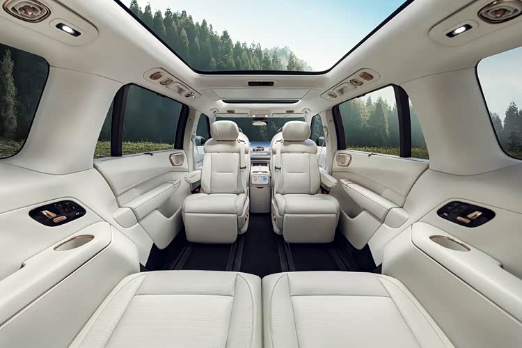 新车提供极夜黑、云晞灰、拂晓白、曜日银、晨晖蓝5种车身外观色,以及赤霞橘、日光米、星夜蓝3种内饰配色。全车六座均采用NAPPA真皮座椅,且支持加热、按摩功能。第三排座椅宽度约1.1米,靠背支持最大155度电动调节。第二排和第三排座椅一键放倒后可形成一张1.9米大床。车内还配有隔热天幕、31扬哈曼卡顿音响系统、9L容积冷暖冰箱、二排折叠桌板、220V电源插口等配置。座舱采用环保内饰材料,并获得由中国汽研颁发的行业首个“母婴级健康汽车”认证。