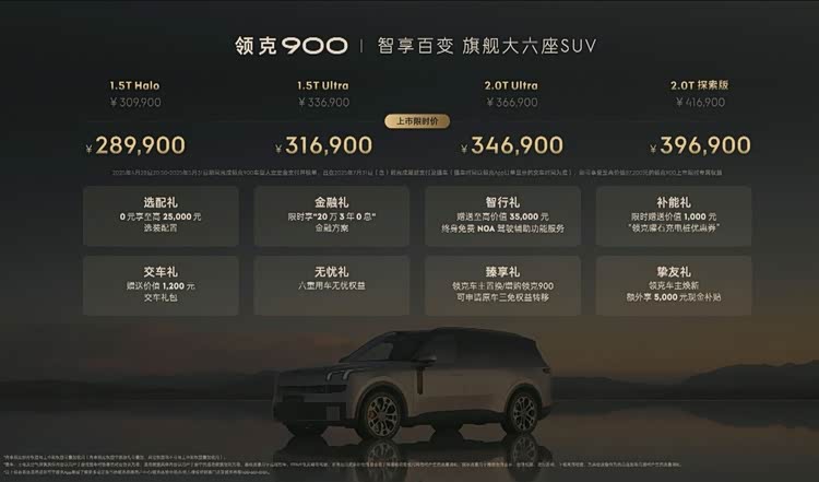 4月28日,领克汽车旗舰六座SUV 领克900(参数|询价)正式上市,推出1.5T Halo、1.5T Ultra、2.0T Ultra、2.0T探索版四款车型,限时售价区间为28.99万-39.69万元。作为领克品牌迈向高端市场的重要战略产品,该车型基于SPA Evo大型电混车专属架构打造。新车上市仅1小时,大定订单量便已突破10000台。