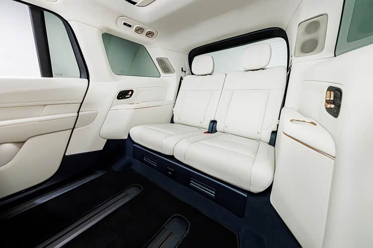 全车四门配有电容感应隐藏式门把手和静音电吸功能。二排车门配备四段式限位器,可向外旋转90度,搭配双侧电动脚踏板,方便乘员进出。车尾采用天地门设计,地门完全打开后离地高度为825mm,最大承重可达300kg。