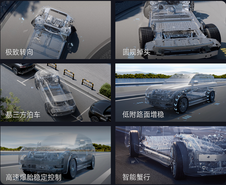 易四方:四电机独立驱动+后轮双电机独立转向架构,具备极限防滑:暴雨、冰雪天气降低车身失控风险,恶劣天气出行无忧;平行横移:极限场景整车横着走,提升行车机动性;爆胎稳行:双轮同侧 160km/h爆胎仍能保持直线行驶无偏移;定轮旋转:实现绕任意车轮定点旋转,让出行和泊车轻松又便捷