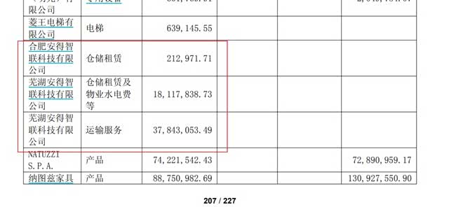 据顾家家居2024年报显示,合肥安得智联科技有限公司为公司提供仓储租赁,涉及金额21.3万元;芜湖安得智联科技有限公司为公司提供仓储租赁及物业水电费等、运输服务,分别涉及金额为1811.78万元、3784.31万元。顾家家居向芜湖安得智联提供宿舍租赁及水电费等、纸箱、液压车设备,分别涉及金额28.69万元、2358.85元、1960.28元。