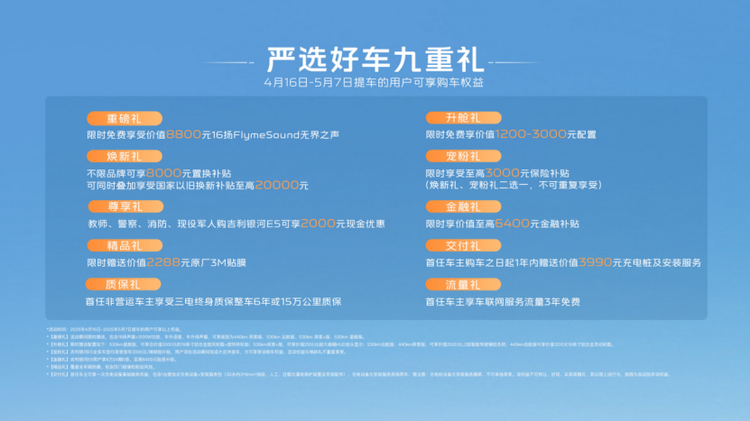 先算笔经济账:全系车型敞开怀抱,甭管你开的是五菱宏光还是BBA,置换直接补贴8000元,国家以旧换新再叠加2万,光是现金部分就省出一台五菱宏光MINI。更狠的是,现在下手还能白嫖价值8800元的FlymeSound无界之声音响(指定车型专属)、6400元免息贷款额度、3000元保险红包(和置换补贴二选一),连L2级组合辅助驾驶和HUD抬头显示都敢免费送,首任车主甚至能终身享受三电质保+充电桩安装服务。这波操作下来,综合价值分分钟破万,四舍五入省出一趟欧洲十日游。