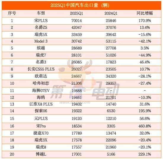 排名榜单第一的是比亚迪宋PLUS,一季度取得了70014辆的销售成绩,这得益于比亚迪在新能源技术领域的优势,刀片电池技术带来的高安全性与长续航特性,使其在欧美市场快速建立口碑。目前宋PLUS通过混动与纯电双动力路线,覆盖了东南亚市场与欧洲市场的不同需求。