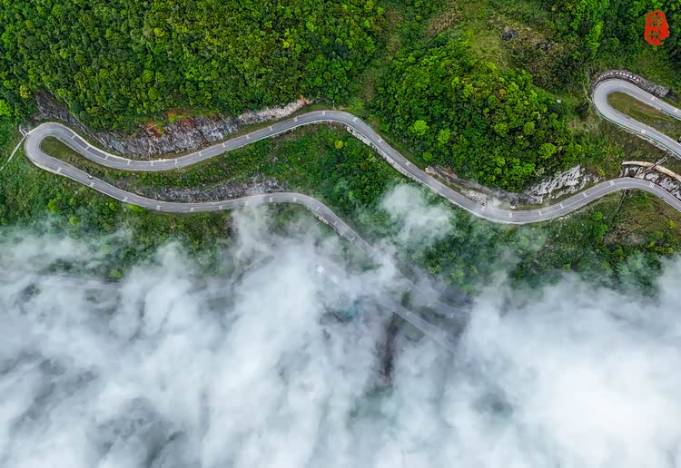 为了记录这条公路的美景,我们特地选了一处平坦的台地,泊下车来,升起无人进行了航拍。从空中俯瞰,21 道拐就像一条灵动的巨龙,在云雾间若隐若现。云雾时而轻柔地缠绕着公路,时而又迅速散开,露出道路的轮廓,如梦如幻。远处的山峦在云雾的笼罩下,也变得朦胧而富有诗意,与蜿蜒的公路构成了一幅绝美的山水画卷。