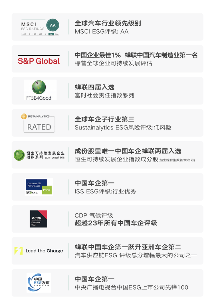 凭借ESG管理工作的推进落地、全面详尽的ESG信息和战略披露、和利益相关方的充分交流探讨,吉利汽车2024年ESG相关工作赢得外界的广泛赞誉和权威认可,包括连续三年荣获《财经》双碳领导力“卓越”评级,连续两年位居“中国ESG上市公司先锋100”榜单第八、蝉联中国车企第一名,还获得国际最具权威性的MSCI ESG评级AA级,且连续两年入选恒生可持续发展企业指数,ISS ESG评级行业优秀、中国车企第一等荣誉,充分印证了吉利汽车的中国车企ESG标杆地位。