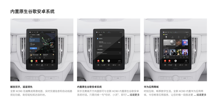 科技配置:沃尔沃XC90搭载原生安卓系统,支持华为HiCar/苹果CarPlay,大尺寸屏幕分辨率高,导航地图可投射至全液晶仪表,实时显示路况信息。