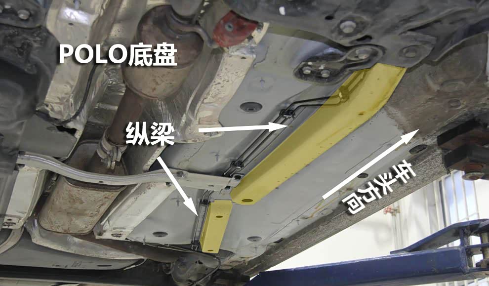 同样为PQ25平台的POLO,其底部纵梁前半部分与新捷达保持一致,但是后半段纵梁采用分段式设计,虽然没有与前半部连成一体,但仍有独立的纵梁保证其车身刚性。