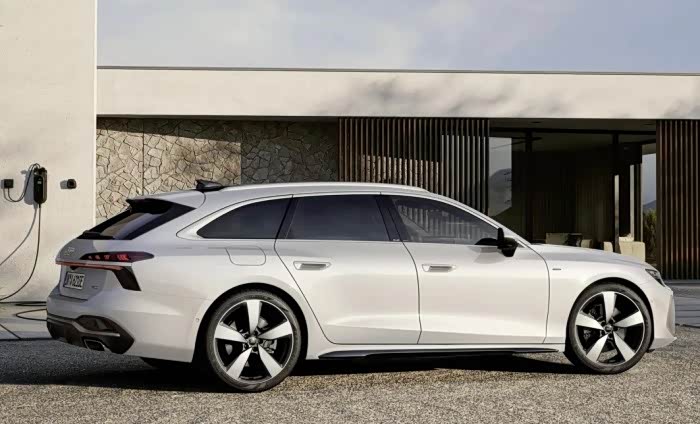 车身侧面线条简洁流畅,配备电动伸缩门把手。左侧后方设置充电接口,右侧后方为加油口。新车搭载全新设计的多辐大尺寸轮圈,并搭配红色卡钳。尾部采用贯穿式尾灯设计,与装饰条融为一体,两侧灯组保留奥迪标志性造型。后保险杠造型动感,采用双边共两出排气布局。旅行版车型在后窗上方增设更具运动感的扰流板。