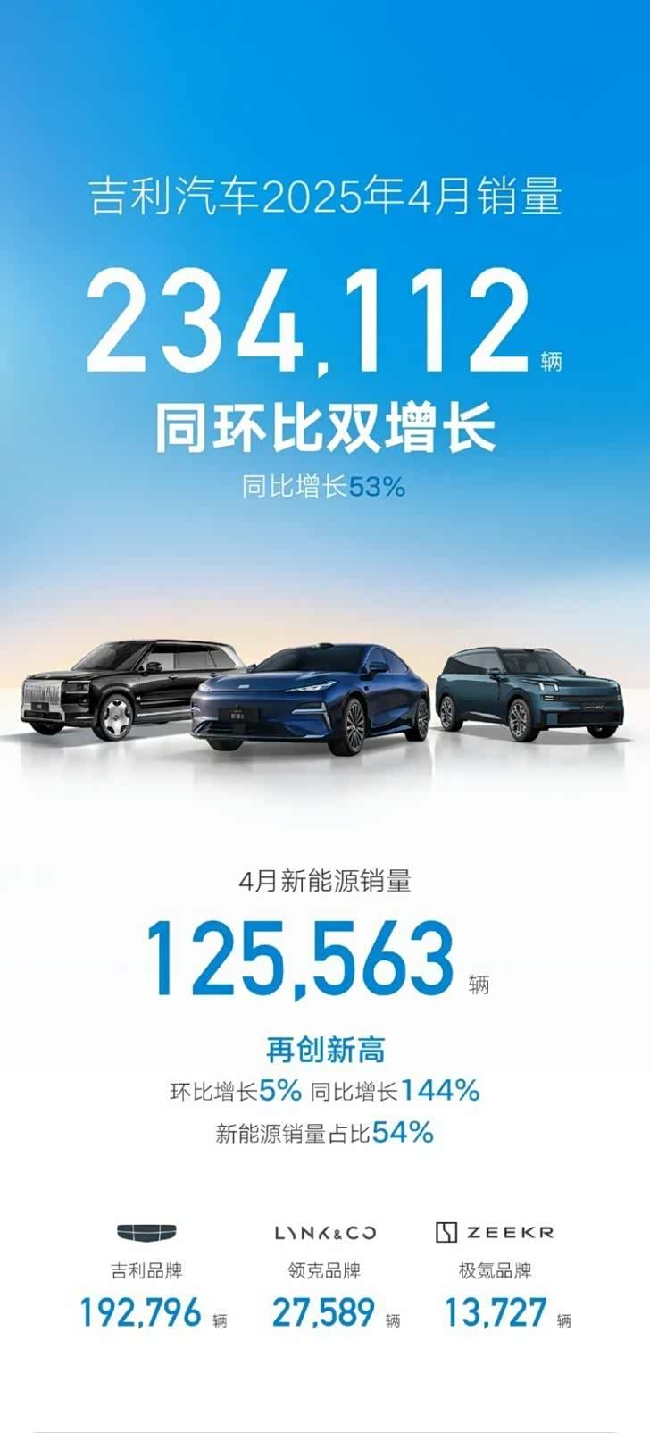 从集团层面看,吉利汽车近年来不断加强品牌的整合,试图将过去相对分散的车型进行整合,这一措施的实施在销量上也得到了较好回报。4月吉利汽车销量23.41万辆,同比增长53%;其中新能源板块销量12.55万辆,同比暴涨144%,可谓是大增。