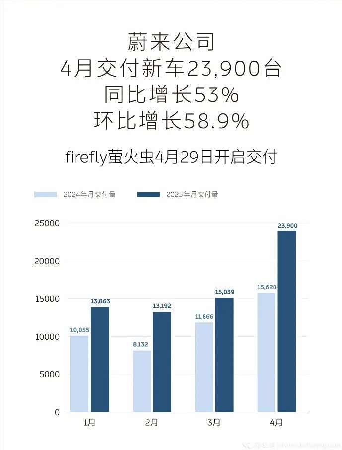 而曾跻身新势力三强的蔚来,在经历一季度销量低谷后,4 月迎来显著反弹。主品牌蔚来交付 19269 辆,第二品牌乐道交付 4400 辆,第三品牌萤火虫也于 4 月 29 日正式开启交付进程。