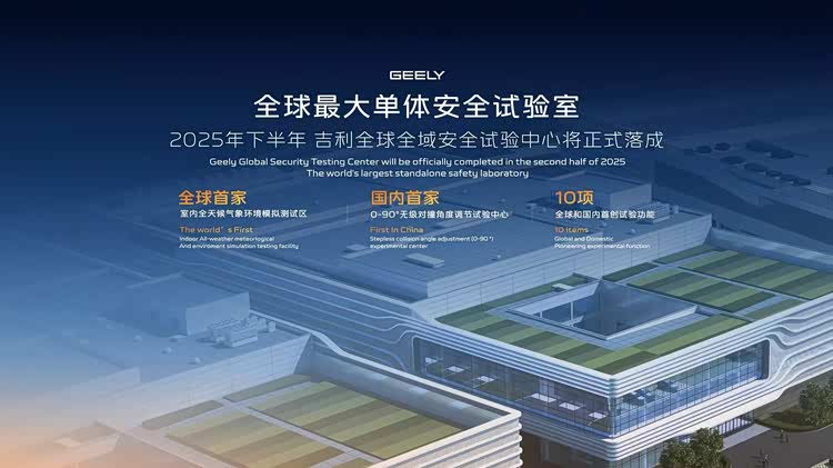 今年就要正式落成并投入使用的吉利全球全域安全试验中心,也将向全行业开放。投资20亿元的吉利全球安全试验中心拥有全球首家室内全天候气象环境模拟测试区,是国内首家可0~90度无级对撞角度调节的试验中心。此外,吉利全球全域安全试验中心还拥有10多项全球和国内首创的试验功能。