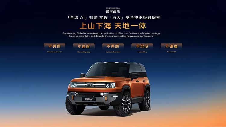 此外,银河战舰承载着吉利对“不失控、不自燃、不失联、不沉没、不碰撞”五大安全技术的极致探索。“满血版”AI数字底盘,让银河战舰拥有蟹行、原地掉头、爆胎行驶等技能,还能实现“无人漂移”,吉利自研的GVMC车身稳定系统,让银河战舰实现80km/h麋鹿测试速度,在硬核SUV中全球第一。银河战舰搭载的“神盾金砖电池”,搭配拥有10倍耐磨、抗冲击能力的防弹涂层,就像给电池穿上了防弹衣,保护电池电芯不变形、不起火、不爆炸。吉利独有的卫星星座,让银河战舰即使在无人区,也可以实现双向卫星通信。银河战舰配备了涉水雷达,以及行业独有的车载声纳,具备800mm的超高涉水能力,可连续浮水2小时,航行速度超过8.5km/h(4.6节)。