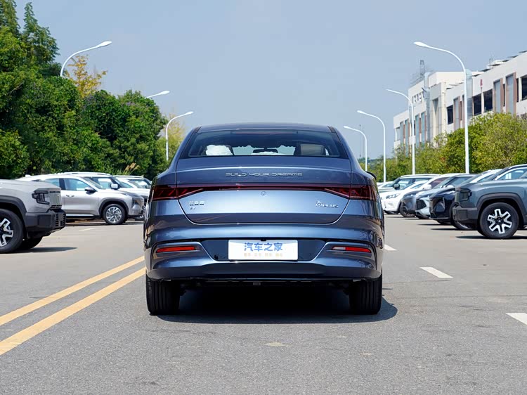 秦PLUS EV的尾部采用多根横幅式饰条勾勒,中间配备贯穿式尾灯组,灯组内部交叉状灯带比较有设计感,后包围造型则比较稳重。