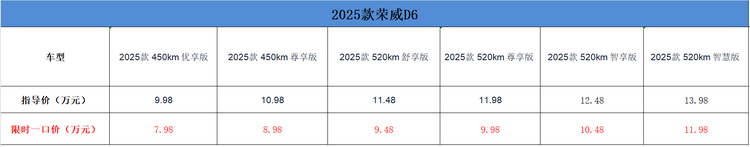 作为上汽荣威旗下的全新紧凑型轿车,荣威D6采用上汽新一代星云纯电架构打造,指导价为9.98-13.98万,而为了进一步提升竞争力,上市也给出了限时一口价:7.98-11.98万,这个价格是不是很熟悉?很明显,荣威D6直接将目标锁定了比亚迪秦PLUS系列车型,而因为荣威D6是一台纯电轿车,所以我们选择2025款秦PLUS EV进行对比,它的指导价为10.98-17.98万,从价格来看,荣威D6的购车门槛更低。