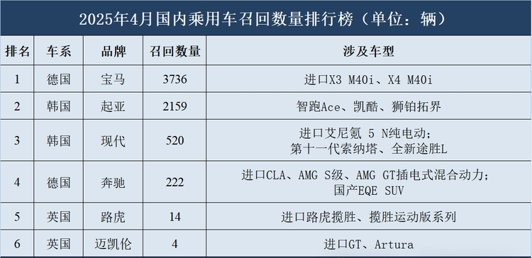 据国家市场监督管理总局缺陷产品管理中心数据,4月共发布乘用车召回公告9则,涉及召回乘用车总量共计6,655辆,环比减少了99.24%。4月召回涉及德系、韩系、英系等3个车系,其中德系品牌召回总量最多,宝马、奔驰共计召回3,958辆,占当月召回总量的59.47%;韩系品牌次之,起亚、现代共计召回2,679辆,占比40.26%;英系品牌路虎和迈凯伦共计召回18辆,占比0.27%。