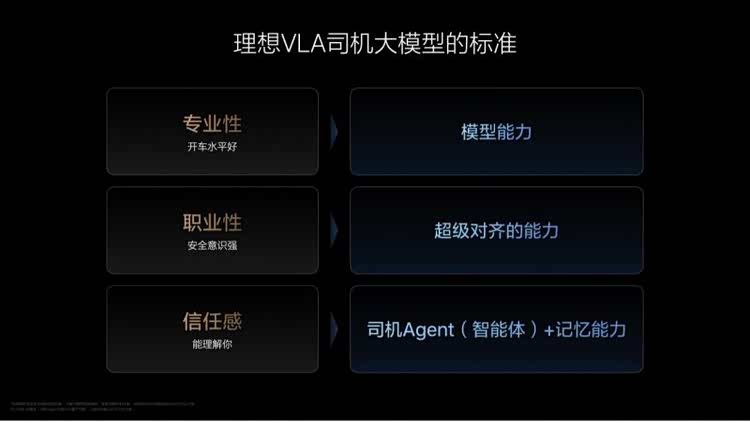 判断司机Agent是否是个好司机,有三个关键标准:专业能力、职业能力和构建信任的能力。VLA司机大模型提升了专业能力,超级对齐增强了职业能力,VLA通过理解自然语言、具备记忆能力提升了构建信任的能力。