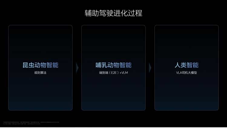 VLA的实现不是一个突变的过程,是进化的过程,经历了三个阶段,对应理想汽车辅助驾驶的昨天、今天和明天。第一阶段,理想汽车自2021年起自研依赖规则算法和高精地图的辅助驾驶,类似“昆虫动物智能”。第二阶段,理想汽车自2023年起研究,并于2024年正式推送的端到端+VLM(Vision Language Model,视觉语言模型)辅助驾驶,接近“哺乳动物智能”。
