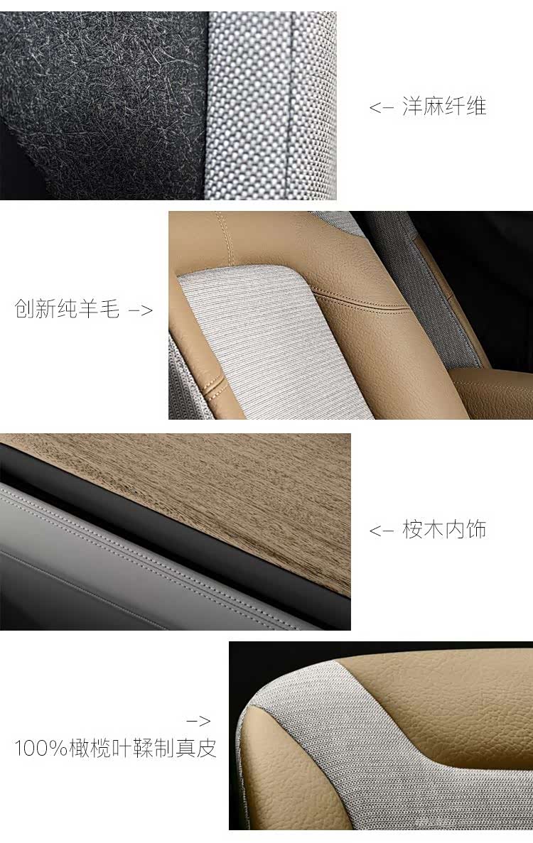 纯电动i3所用真皮材料100%经过橄榄树叶的天然鞣革剂鞣制,这一加工工艺的优势在于:橄榄叶本是橄榄种植业的副产品,通过皮革鞣制工艺得到了很好的利用。鞣制加工本身符合环保要求,而且还能保留皮革的自然光泽和调温功能。