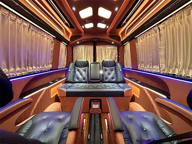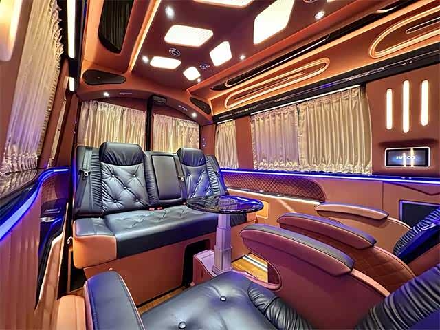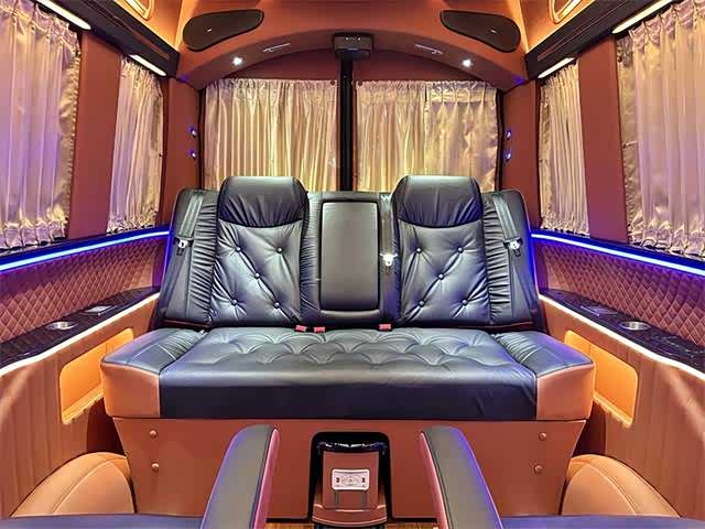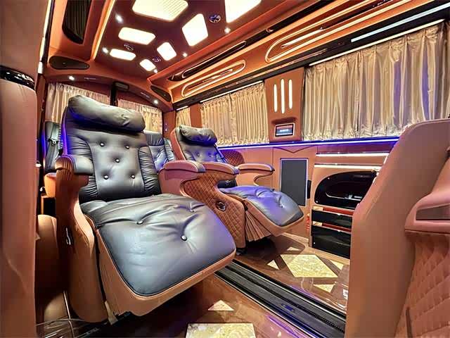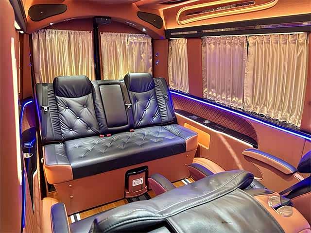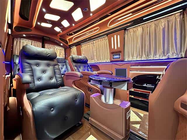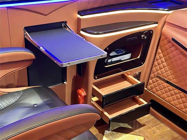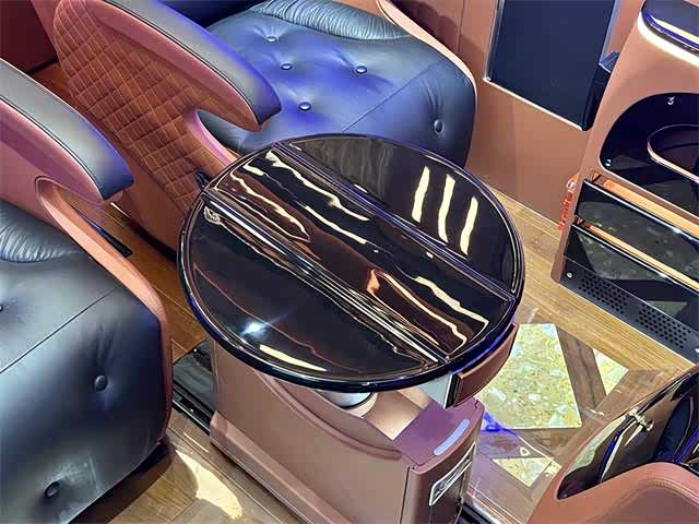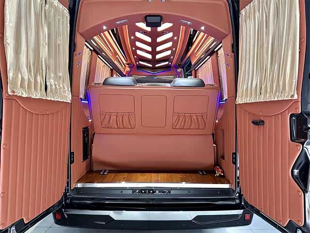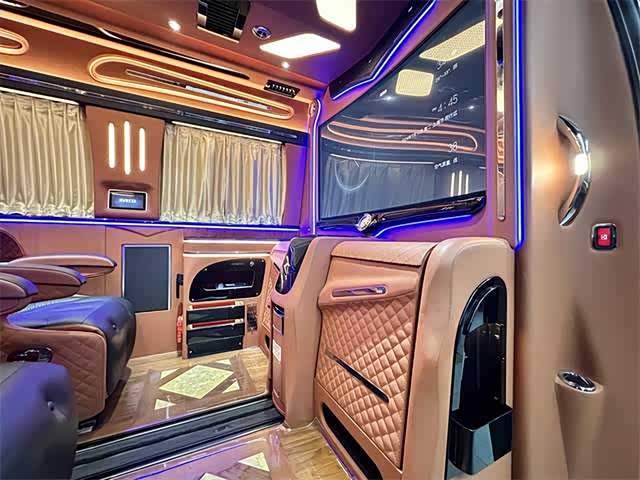 2. 内饰:内部空间宽敞明亮,采用高品质材料打造。座椅舒适度高,具备多向调节功能,部分车型配备豪华航空座椅,支持电动调节、加热、通风及按摩功能,带来头等舱般的舒适体验。车内设有可折叠办公桌、独立阅读灯、USB充电接口等人性化设计,形成功能齐全的“移动办公室” ,满足商务办公与休闲阅读需求。此外,还有车内氛围灯、隐私窗帘、柚木地板等,提升车内的豪华感与私密性。