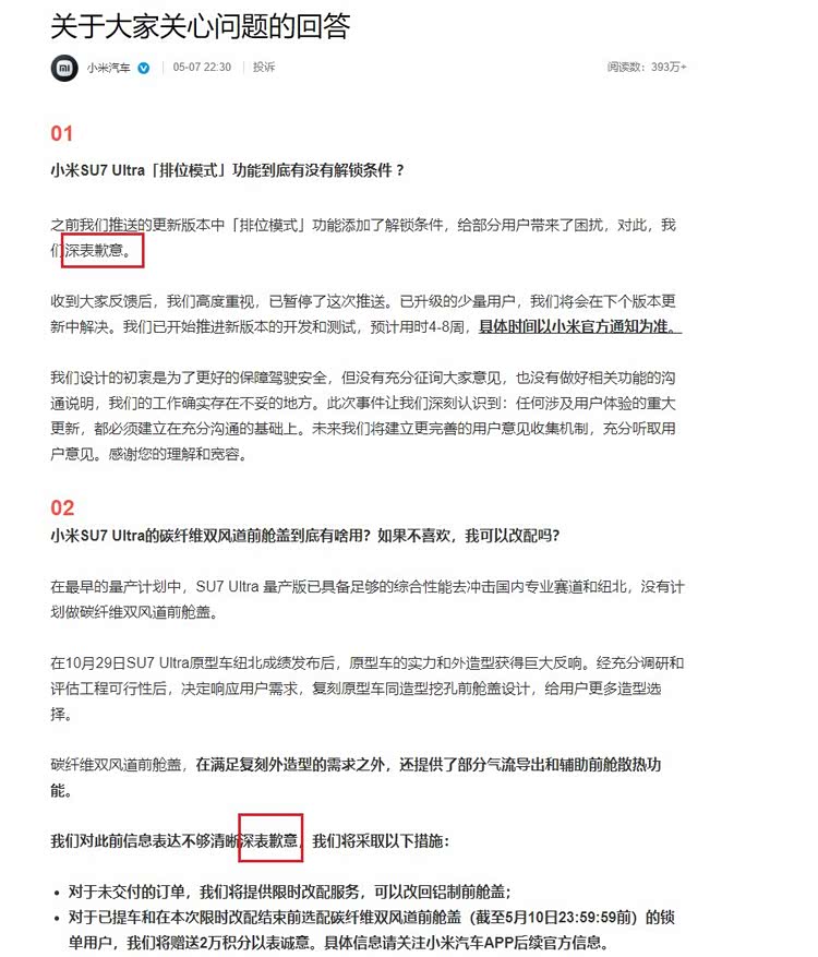 5月7日深夜,小米汽车官方发布一个声明,就近期小米SU7 Ultra车型引发的两项争议,两次“深表歉意”。