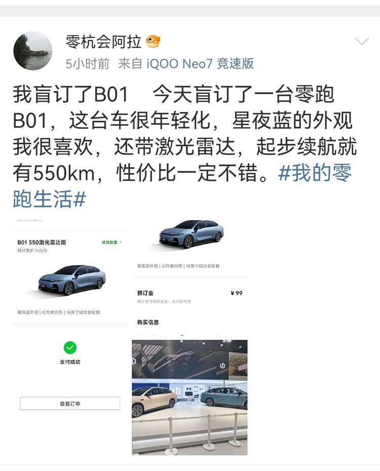 还有零跑老车主后悔买早了,“虽然C16已给我们带来诸多美好回忆,但B01‘年轻无界,敢想敢闯’的理念,完美契合年轻人积极向上的生活态度。它不仅是出行工具,更是彰显生活态度的伙伴,期待未来能与它一同探索更多未知精彩!”