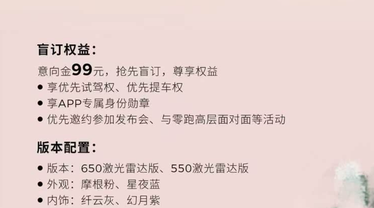 虽然此次盲订车型仅包括650激光雷达版和550激光雷达版,售价锁定在15万元以内,但消息一发布,很快就掀起了一股抢订潮,毕竟比零跑B01先上市的零跑B10,当时开售仅两天时间就收获3.17万订单,16天即完成1万台下线,参考当前B10的售价(9.98万-12.98万,激光雷达版11.98万起),作为轿车的B01,同样配备激光雷达、高通8295座舱芯片,定价如果接近,上市后势必一样火爆。