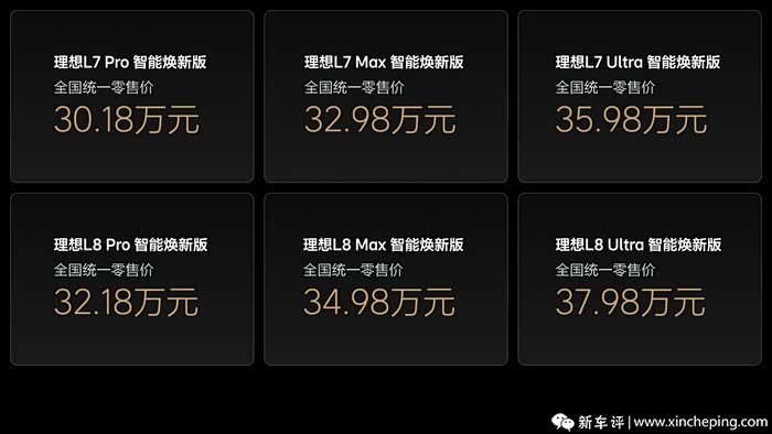 5月8日,理想汽车宣布L系列智能焕新版正式上市,涵盖L7、L8、L9三款车型。此前, 理想L6(参数|询价)智能焕新版已于上海车展期间上市,售价区间为24.98-27.98万元,此次L6智能焕新版也将同步获得最新权益。新车型价格方面,理想L7智能焕新版售价30.18-35.98万元,理想L8智能焕新版售价32.18-37.98万元,理想L9智能焕新版售价40.98-43.98万元。官方表示,新车今日开启大定,下周正式开启交付。