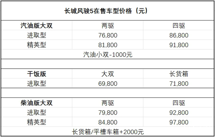 长城风骏5在市场中的定位十分明确,这款皮卡拥有着典型的工具属性设定。从价格表来看,汽油版(包括干饭版)价格在6.98-9.18万元,柴油普通版在7.98-9.78万元,配备长货箱和平底货箱的车型整体价格要更高一些,但总体裸车价格都在10万以内,是许多消费者低价购车的首选。