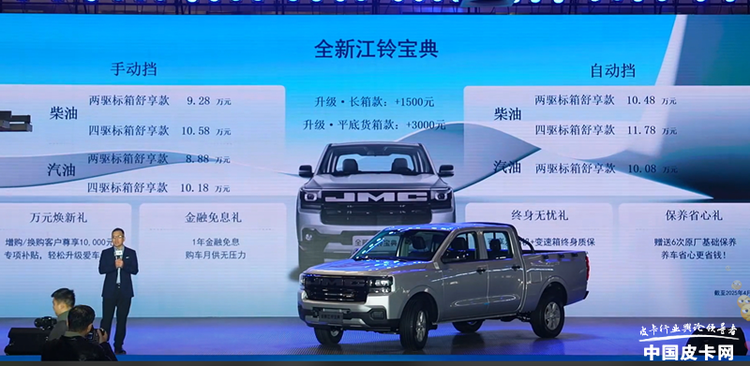 今年3月,江铃皮卡旗下全新宝典正式上市,新车仍然定位8万级市场,根据汽油/柴油、手动/自动、两驱/四驱、标箱/长箱/平底货箱以及配置等分为多款车型,售价区间为8.88-11.78万元。