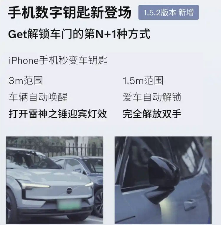 在此次更新中,EX30新增了手机数字钥匙功能,支持iPhone与车辆绑定后实现近场交互操作。当用户携带手机靠近车辆3米内,车辆可自动启动迎宾灯效;当距离缩小至1.5米以内时,车门可自动解锁,实现无需实体钥匙的进入体验。