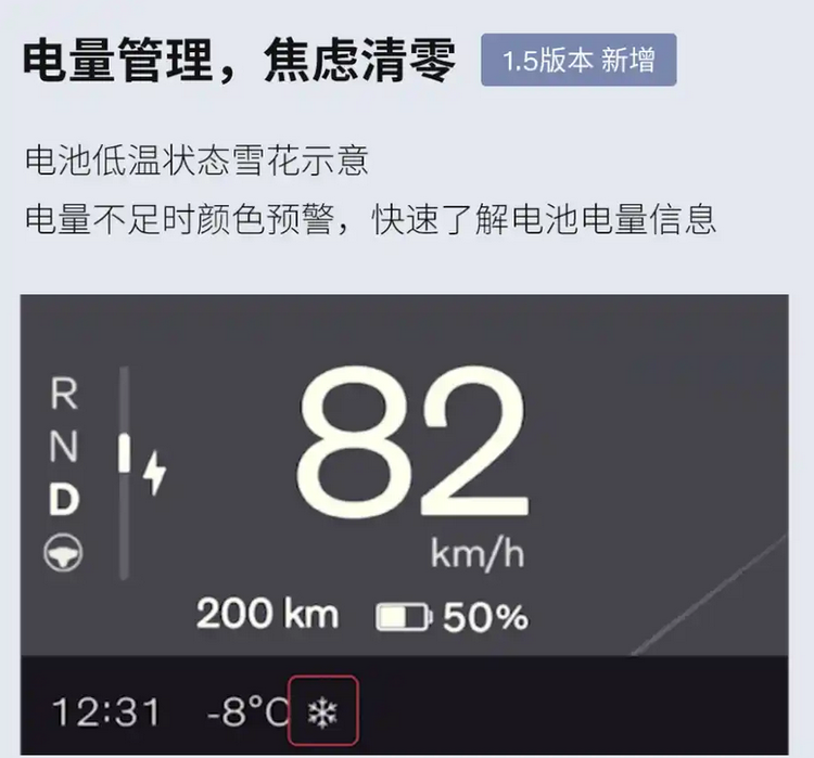 在电池管理方面,新增电量低温提醒功能。当动力电池处于低温区间时,系统将以雪花图标进行提示;若电量接近预警线,界面则通过颜色变化提供视觉提示,便于用户根据剩余续航合理安排行程。