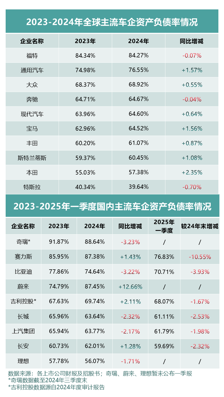 汽车行业因重资产属性普遍存在高负债现象,但中国车企的负债率正呈现显著下降趋势。以比亚迪为例,2025年一季度其资产负债率已从2024年的77%降至70.7%,半年内下降近7个百分点,年内有望迈入“60%”区间。相比之下,福特、通用等国际车企负债率长期高于75%,大众、丰田等品牌负债率亦维持在60%以上,且缺乏明显改善动力。