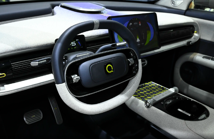 来到车内之后,可以看到全新奇瑞QQ概念车的内饰设计还是比较科幻的,如果未来要走性价比这条路,那么量产之后的全新奇瑞QQ一定不会设计成这个样子,毕竟成本上就说不过去。不过集成式的电子怀挡,以及造型简约时尚的双辐式方向盘和中控大屏还是会得以保留。而且值得一提的是,目前这台概念车还用到了许多环保材料,同时整张座椅也集成了大量的字母“Q”元素。
