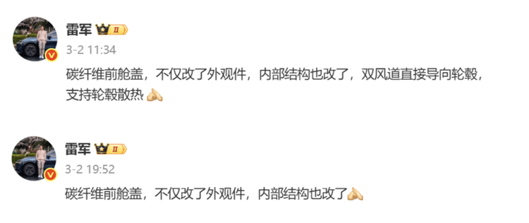 从话术上看,小米方面底气不足,强调了“复刻外造形”,气流导出和前舱散热功能只提供了“部分”。这番话当然难为公关部了,他们必须要在产品实际能力和雷军承诺之间找平衡(雷军说SU7 Ultra有8组风道,17个真风口)。