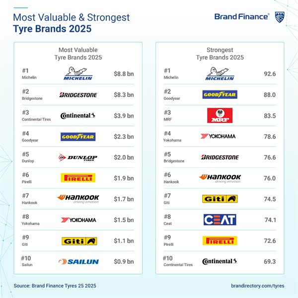 近日,国际权威品牌价值评估机构Brand Finance发布了2025全球轮胎品牌价值榜单。佳通轮胎再次蝉联全球轮胎品牌第九位,品牌强度指数排名第七位,并以16%的年增长率位列全球增长最快五大轮胎品牌。