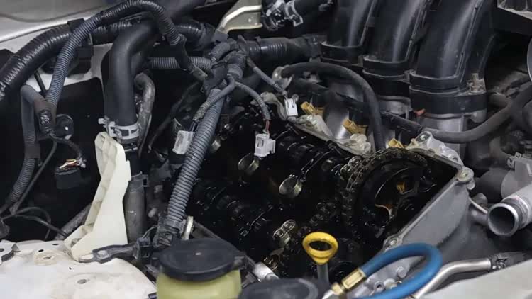 开搞了,打开气门室盖的一瞬间,乌漆嘛黑的内部机械状态映入眼帘。