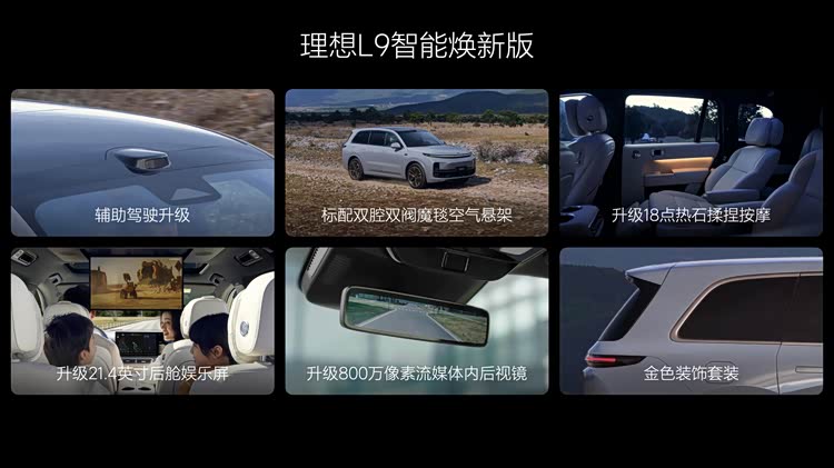 除智能升级外,新车还在外观造型、底盘等方面的产品力进行了增加,包括理想L6智能焕新版新增天青色外观颜色,理想L7和L8智能焕新版新增蓝灰外观颜色,理想L9智能焕新版新增雅灰外观颜色,理想L系列智能焕新版全系新增全新黑棕双色内饰,以及全新设计的20英寸、21英寸轮毂;理想L7和L8智能焕新版新增双腔魔毯空气悬架;理想L9智能焕新版新增双腔双阀魔毯空气悬架、18点热石揉捏按摩、21.4寸家庭影院、800万超清流媒体内后视镜等。