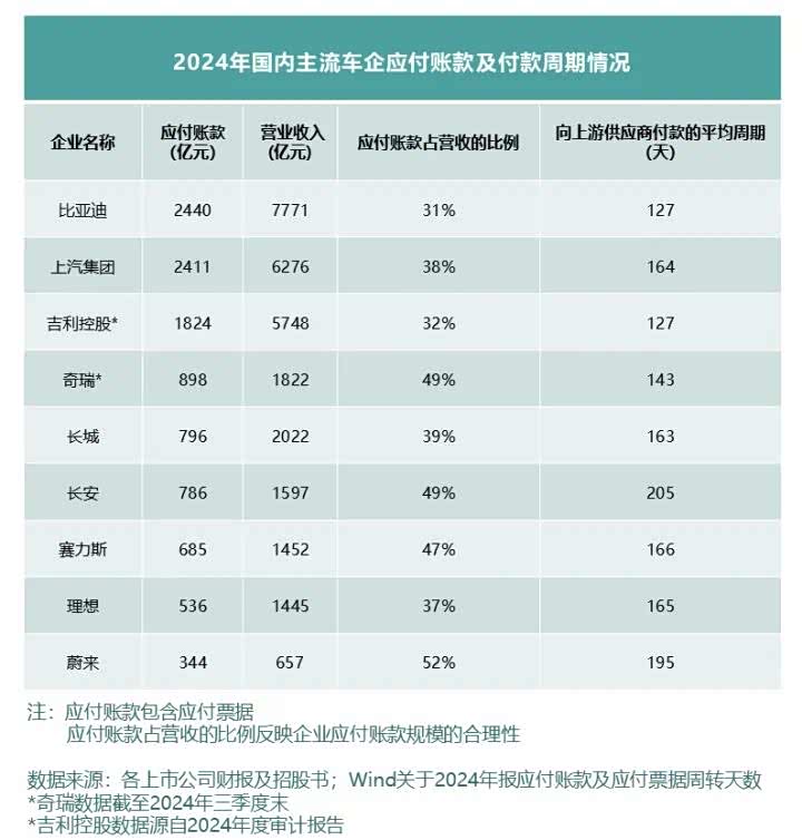 2024 年,国内车企应付账款在营收的占比呈现出了明显的差异化。
