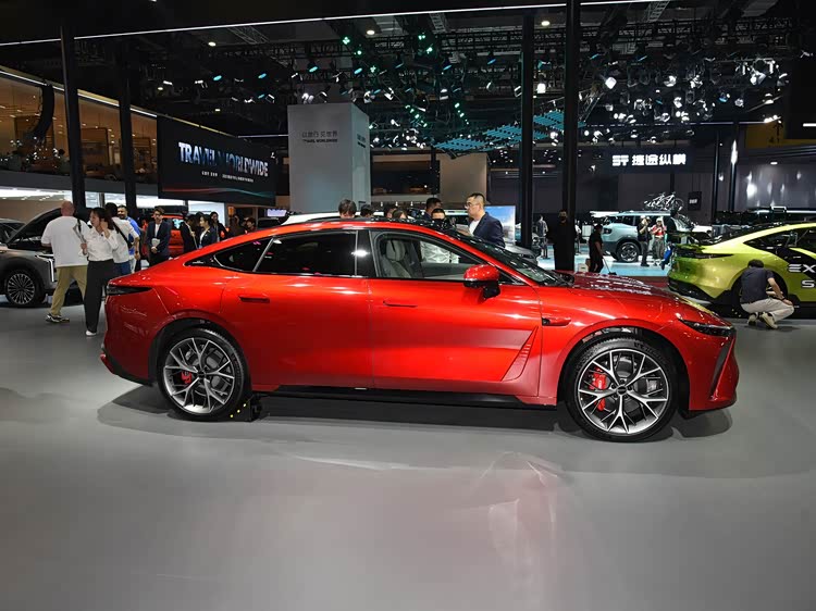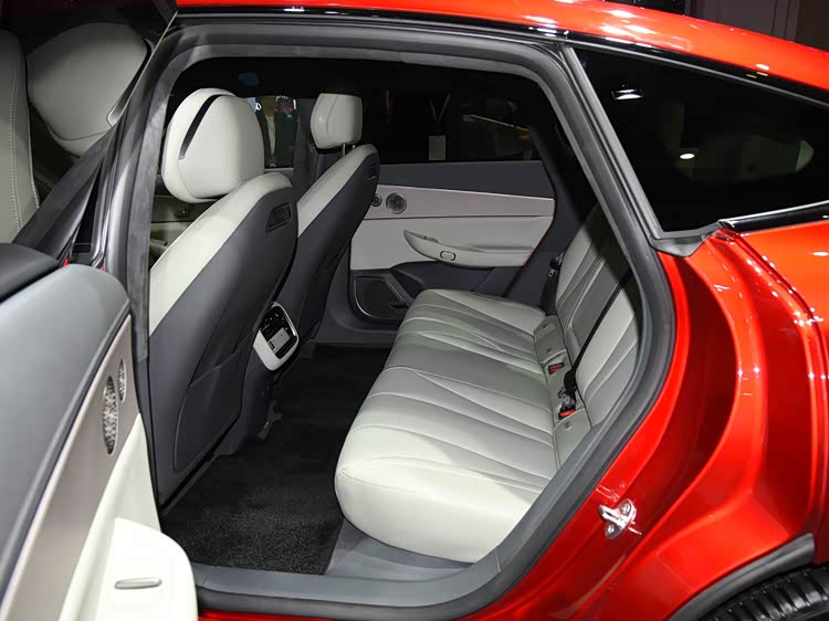 侧面造型方面,车顶采用了溜背式造型,无框车门也没有缺席,有着浓浓的轿跑风格;腰线采用了贯穿式设计,让车身显得修长大气,门把手采用的是弹出式设计,属于目前新能源车常见的设计语言,能够起到降低风阻的作用;轮毂采用了五辐式造型,有着比较强的运动感。