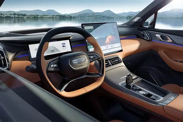再来看看新款博越L内饰,第一感觉就是这车的内饰质感提升了不少。采用时下流行的环抱式座舱设计,配有10.25英寸全液晶仪表盘和 15.4 英寸 2.5K 中控屏。车机用的是 Flyme Auto 智能座舱系统,支持四音区语音控制,你在车里各个角落发出指令,它基本都能精准识别,像导航、放音乐、调空调这些操作,动动嘴就行。25.6 英寸的 AR - HUD 抬头显示也很实用,导航信息直接投射在前挡风玻璃上,安全又方便。
