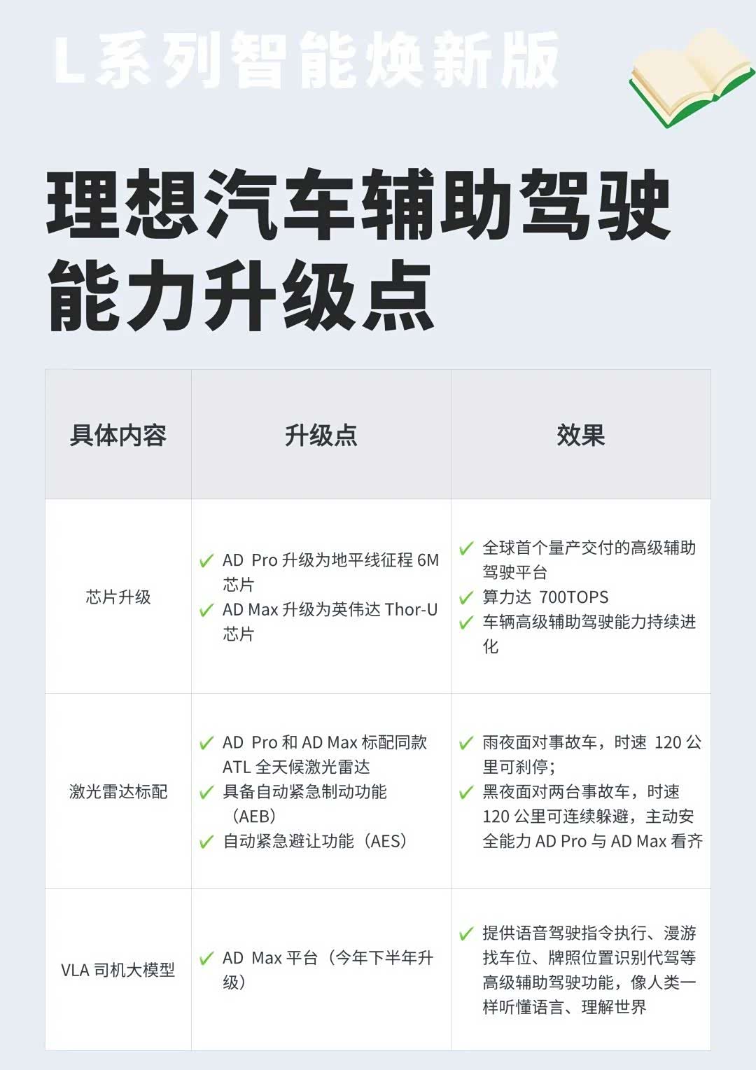 理想在5月8号发布了L系列的智能焕新版,升级包括理想同学更“人性”了(外形+记忆能力+CUA模型),底盘更舒适了,电池更大了(L8/7 Max向Ultra看齐),豪华配置更多了(座椅按摩、家庭影院、800万像素的流媒体内后视镜),当然我们最关注的还是在辅助驾驶能力上的升级。