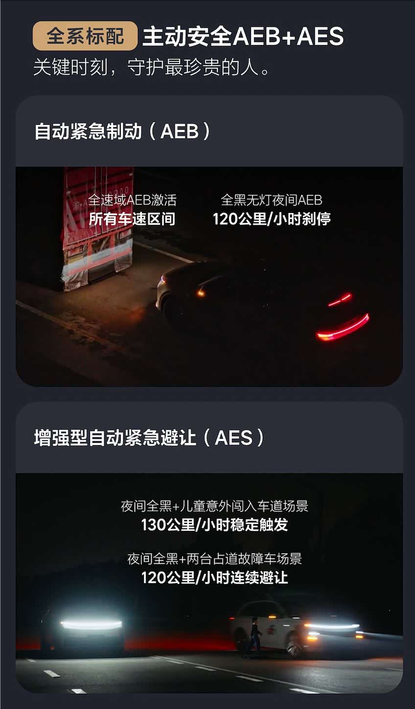 辅助驾驶硬件上,AD Pro与AD Max的主要区别在于智驾芯片,但在主动安全能力上并没有区别,形成360°AEB安全盾,“360°”意味覆盖低速、异形障碍物、路口转弯等场景;比如全速域AEB激活(自动紧急制动),所有车速区间内可激活功能;AES(自动紧急避让)也支持在130km/h触发。