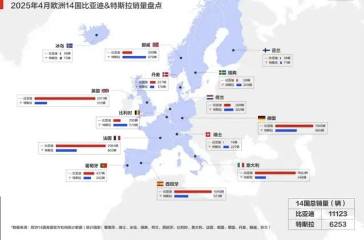 4月份,比亚迪以覆盖欧洲14国、11,123辆的月销成绩,大幅领先特斯拉的6253辆,在德国、英国、法国、意大利、西班牙等核心市场全面领跑,彻底改写了旧有格局,在特斯拉的欧洲粮仓连插数面红旗。